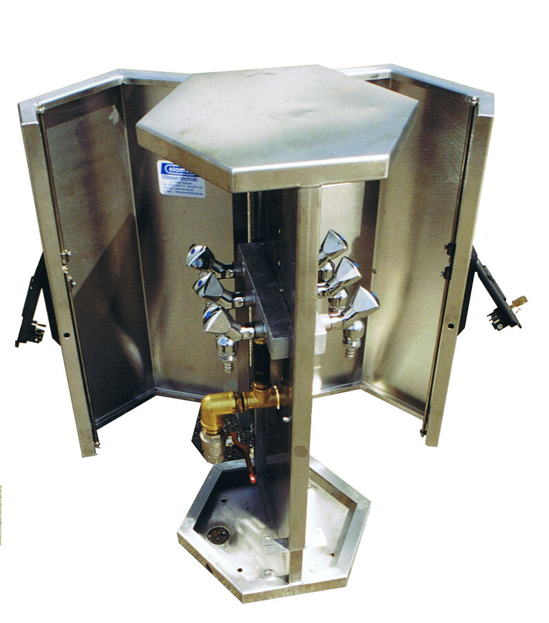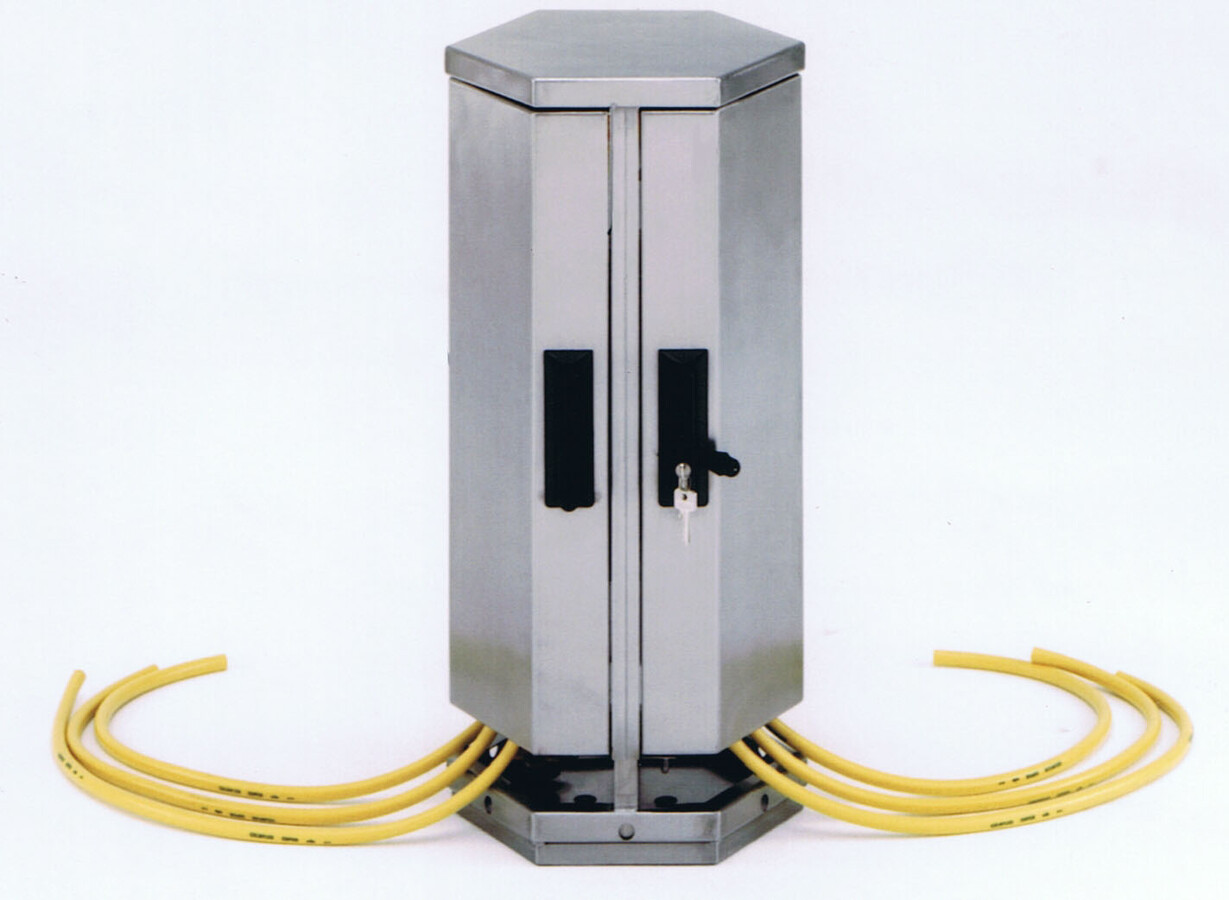 Jedná se o nerezovou šestiúhelníkovou skříň pro distribuci vody do šesti vedení s připojením ½" s možností měření odběru a s vestavěným snížením tlaku. Skříň je uzamykatelná, má rozměry 400 x 400 x 700 mm a váhu 10 kg.